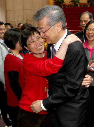 柯長珠一見到陳沖走來,大方在眾人面前獻上“愛的抱抱”,新任臺當局“行政院長”江宜樺對柯長珠說“‘院長’就拜托你了”,讓陳沖忍不住紅了眼眶。