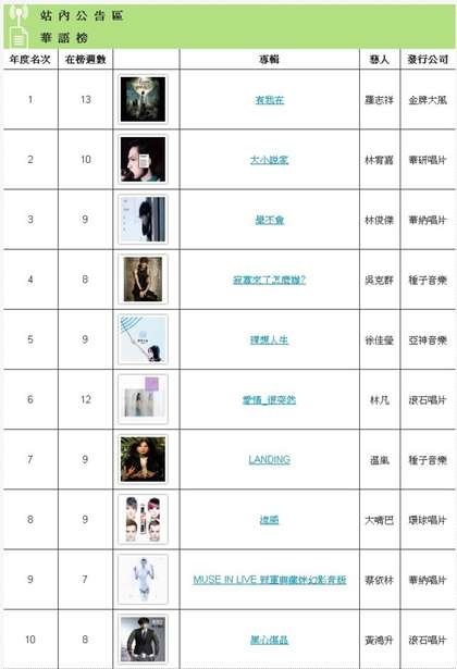 中國臺灣網(wǎng)2月18日消息 據(jù)臺灣媒體報道,臺灣中廣音樂網(wǎng)i Radio 2012年度華語金曲榜揭曉,羅志祥專輯《有我在》進榜13周,榮登王座,亞軍則是林宥嘉的《大小說家》,林俊杰《學不會》在榜9周,摘走季軍。