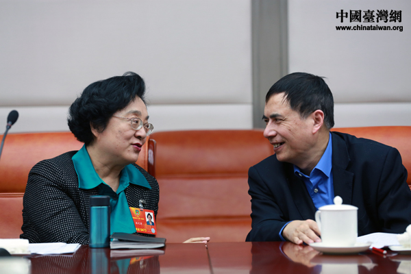 全國政協副主席、臺盟中央主席林文漪在討論會上與臺籍委員楊健交流看法。(中國臺灣網 于斯文 攝)
