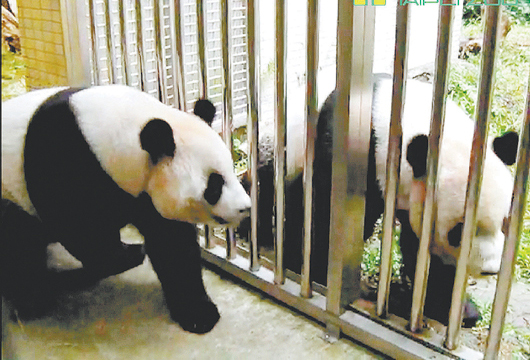母貓熊圓圓(左)進入發情期,不斷磨蹭欄桿向團團(右)示好。圖片來自臺灣《聯合報》