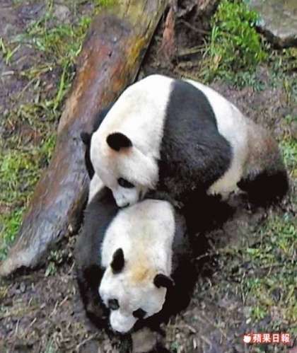 團團(上)、圓圓(下)昨交流熱絡,不時出現咬背挑逗的行為。(圖片來自臺媒)