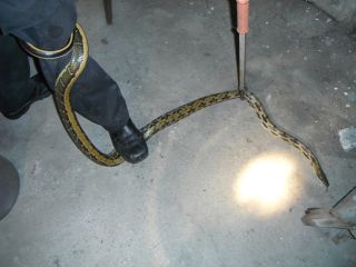 消防隊員接到民眾求助電話,報案民眾說有蛇盤在屋梁上,消防隊員到場查看這只蛇體型巨大,連捕蛇夾都無法控制,只好穿上防護裝備改以徒手上陣,抓到一只2.5米的黑眉錦蛇。從體型研判應該是懷孕的母蛇,捕抓的過程中頻頻吐信,意圖攻擊消防隊員。