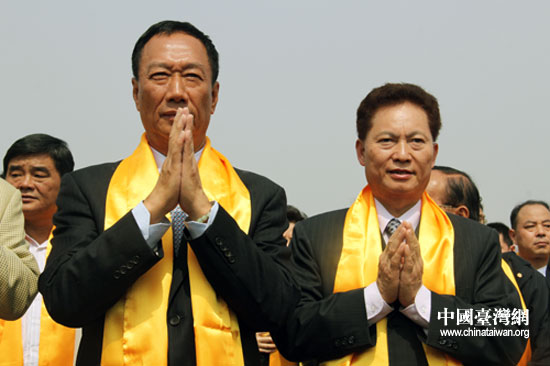 臺(tái)灣鴻海集團(tuán)董事長(zhǎng)郭臺(tái)銘迎駕。(中國(guó)臺(tái)灣網(wǎng) 李典典 攝)