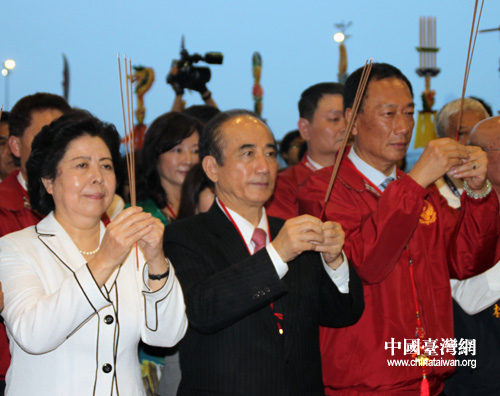 山西省委常委、宣傳部長胡蘇平,臺灣立法機構負責人王金平,臺灣鴻海科技集團董事長郭臺銘拜祭關公祖廟圣像。(中國臺灣網 李典典 攝)