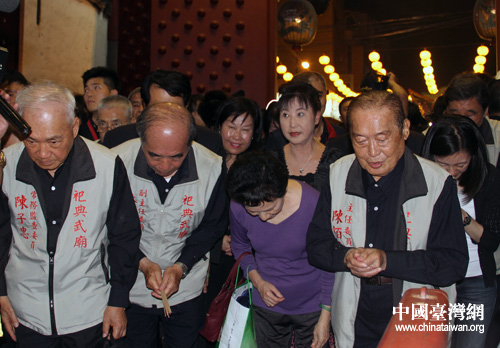 95歲的臺灣祀典武廟主委陳柏青(右一)率信眾恭迎山西關公祖廟圣像駐駕。(中國臺灣網 李典典 攝)
