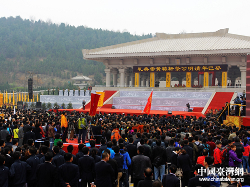 中國臺灣網4月4日黃陵消息 4月4日上午癸巳年(2013)清明公祭軒轅黃帝典禮在陜西黃陵縣舉行,萬余名海內外中華兒女聚首陜西省黃陵縣橋山軒轅殿祭祀廣場,追念初祖功德,表達追思之情。