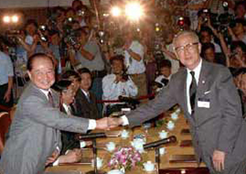 1993年4月,時任海峽兩岸關系協會會長汪道涵與臺灣海峽交流基金會董事長辜振甫在新加坡舉行汪辜會談,會談前,汪道涵(前左)與辜振甫握手。(資料圖)