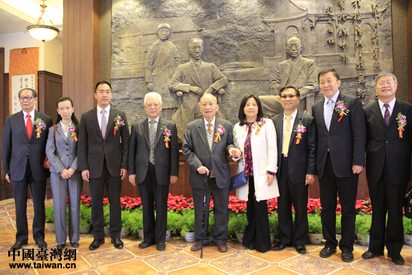 “林獻堂抗日事跡陳列館”暨北京五桂樓會館開館儀式4月28日在北京臺灣街五桂樓舉行。梁啟超之子梁思禮、林獻堂孫媳林芳媖以及參加開館儀式的十一屆全國人大常委會副委員長周鐵農、臺中市副市長蔡炳坤等嘉賓在“梁啟超與林獻堂浮雕”前合影。(中國臺灣網 何建峰 攝)