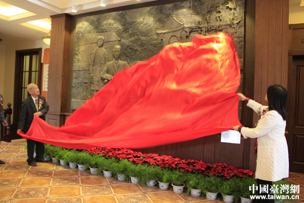 “林獻堂抗日事跡陳列館”暨北京五桂樓會館開館儀式4月28日在北京臺灣街五桂樓舉行。梁啟超之子梁思禮、林獻堂孫媳林芳媖為“梁啟超與林獻堂浮雕”揭幕。(中國臺灣網 何建峰 攝)