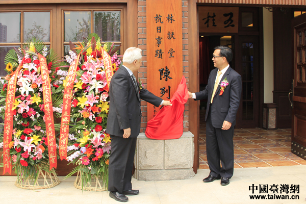 “林獻堂抗日事跡陳列館”暨北京五桂樓會館開館儀式4月28日在北京臺灣街五桂樓舉行。十一屆全國人大常委會副委員長周鐵農與臺中市副市長蔡炳坤為“林獻堂抗日事跡陳列館”揭牌。(中國臺灣網 何建峰 攝)
