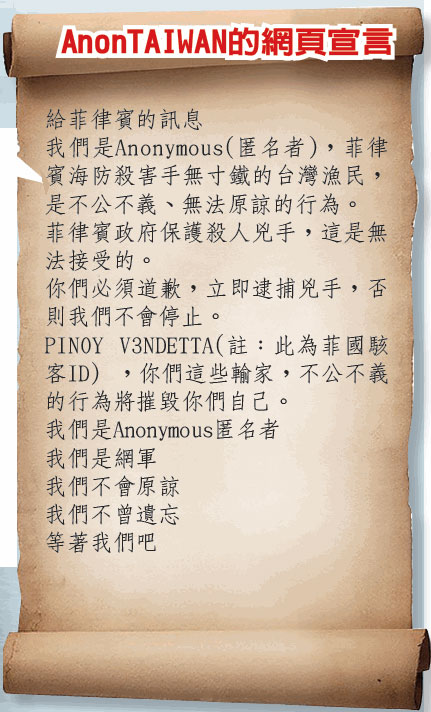 臺灣黑客群AnonTAIWAN的網(wǎng)頁宣言。(圖片來自臺灣《聯(lián)合晚報》)