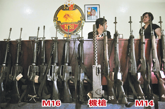 菲律賓國家調查局17日在馬尼拉總部召開記者會前,展示一批由菲律賓海岸防衛隊交給調查人員的武器,菲律賓槍擊臺灣漁船廣大興28號的武器就在其中。圖中為布朗寧機槍,左邊七把為M16步槍,右方六把為M14步槍,這兩型槍枝在越戰時期均被廣泛使用。(圖片來自臺媒)