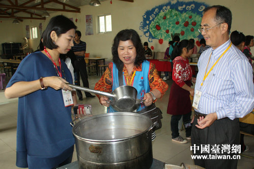 林彩媚團長(左)與參訪團成員一起享用孩子們親手做的午餐。(中國臺灣網 郭瑩瑩 攝)