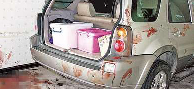 出事的汽車旅館車庫里,顏文興的休旅車身和地上都是血跡。(圖片來自臺媒)