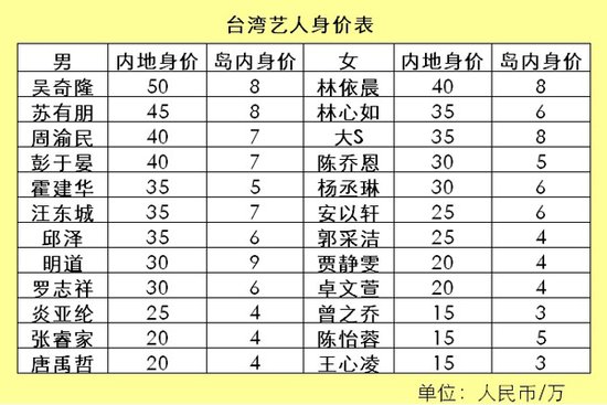 臺(tái)灣藝人身價(jià)表。(圖片來自網(wǎng)絡(luò))