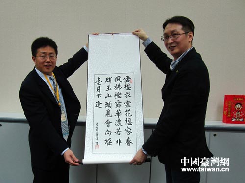 參訪團(tuán)團(tuán)長(zhǎng)薛立勝向臺(tái)灣中時(shí)電子報(bào)總編輯劉善群贈(zèng)送紀(jì)念品。(中國(guó)臺(tái)灣網(wǎng) 許秋玥 攝)