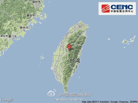據(jù)臺灣“中央社”報道,臺灣中部地區(qū)今天下午13時43分發(fā)生規(guī)模里氏6.3級地震,震央在南投仁愛鄉(xiāng)。(圖片來源:中國地震臺網(wǎng)微博)