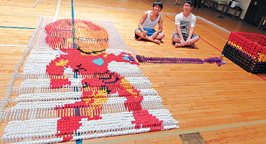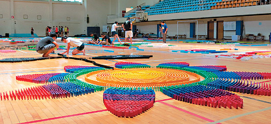 臺灣交通大學(xué)機械系學(xué)生花18個小時,用7000多片骨牌堆成機械系學(xué)生心中的英雄“鋼鐵人”和一棟大樓,當骨牌倒下時,鋼鐵人就像發(fā)射出一道強力將大樓震倒,震撼視覺效果娛樂性十足,掌聲不斷。