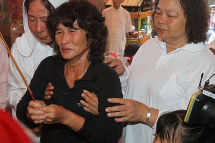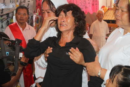 洪石成妻在靈堂祭拜時痛哭。(圖片來自臺媒)