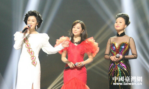 三位來自民間的演唱者演唱鄧麗的代表作,她們分別穿著鄧麗君不同時期的代表性服裝登臺獻唱。(中國臺灣網 郭瑩瑩 攝)