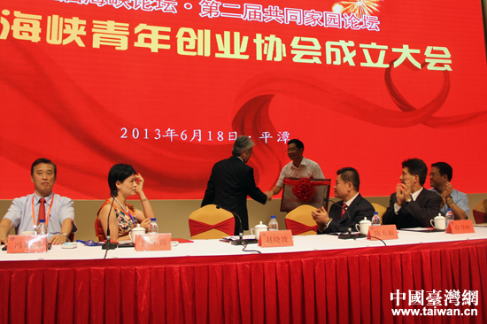 與會領(lǐng)導為平潭海峽青年創(chuàng)業(yè)協(xié)會授牌。(中國臺灣網(wǎng) 王思羽 攝)