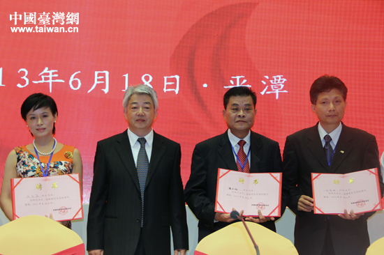 平潭綜合試驗區(qū)黨工委委員、管委會副主任趙曉波向擔任協(xié)會榮譽職務的兩岸精英頒發(fā)聘書。(中國臺灣網(wǎng) 王思羽 攝)