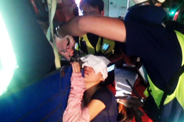 云林縣消防局據報趕到現場,為避免加重傷勢,不敢直接將女騎士救下,只好先用布將傷者頭部包住,再以油壓破壞剪將鐵制卡榫從中剪斷。近半個小時的救援過程中,傷者意識都還算清醒,旁人心驚觀看,但她卻勇敢的沒有喊痛。最后,眼睛上還插著半截鐵卡榫的傷者,被緊急送往彰化基督教醫院救治,有失明的風險。