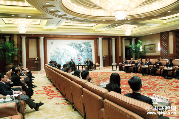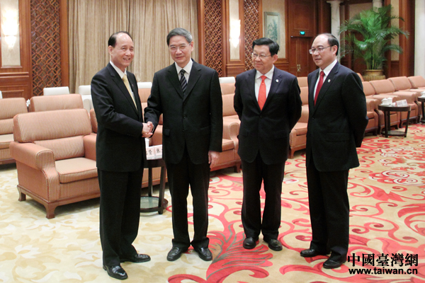 中共中央臺辦、國務院臺辦主任張志軍21日在上海會見了臺灣海基會董事長林中森一行。海協會會長陳德銘等參加會見。(中國臺灣網 于斯文 攝)