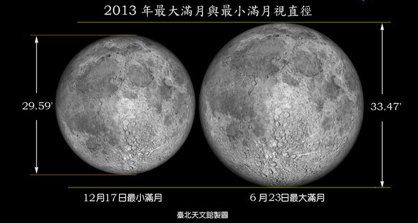 2013年最大滿月與最小滿月直徑圖(圖片來自臺北天文館)