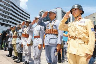 臺灣新黨青年委員會昨天至中山堂抗戰(zhàn)勝利紀念碑前獻花致敬,現(xiàn)場有一群認同抗戰(zhàn)歷史的青年著當年抗戰(zhàn)軍服前來,希望喚起島內(nèi)民眾與當局對抗戰(zhàn)歷史的重視。圖片來源:臺灣《聯(lián)合報》