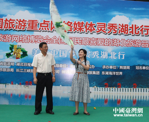 湖北省旅游局副巡視員劉晗為“靈秀湖北行”授旗。(中國臺灣網 李杰 攝)