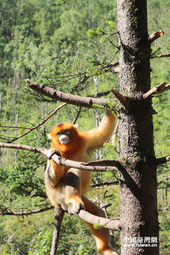 神農架大龍潭棲息著金絲猴部落。金絲猴是中國特有的靈長類動物,屬國家一級保護動物。神農架金絲猴原定為川金絲猴亞種,現經專家確定為神農架獨有種群。(中國臺灣網 李杰 攝)