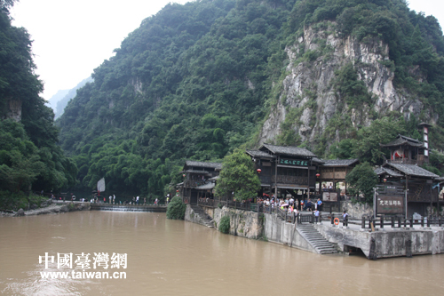 中國臺灣網7月13日宜昌消息 白墻青瓦石板路,小橋流水吊腳樓,13日,首屆全國旅游重點網絡媒體靈秀湖北行記者團走進最后一站——宜昌,當天中午,記者團一行乘船來到宜昌著名的5A級景點——三峽人家,感受了一場煙雨迷蒙的自然、文化夢幻洗禮。