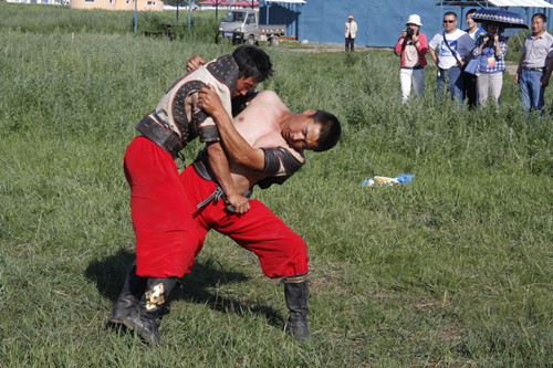 蒙古族的小伙子為臺灣嘉賓表演蒙古式摔跤(中國臺灣網 蕪同 攝)