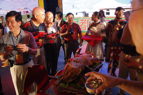 宴會主人為臺灣嘉賓奉上蒙古族的最高歡迎禮:烤全羊(中國臺灣網 蕪同 攝)