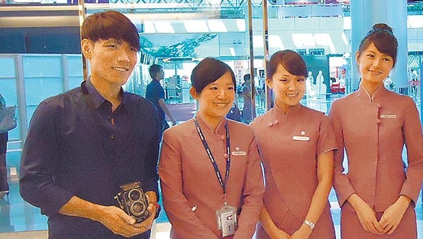 楊宗緯(左)在機場應華航空姐要求合照。(圖片來自臺媒)