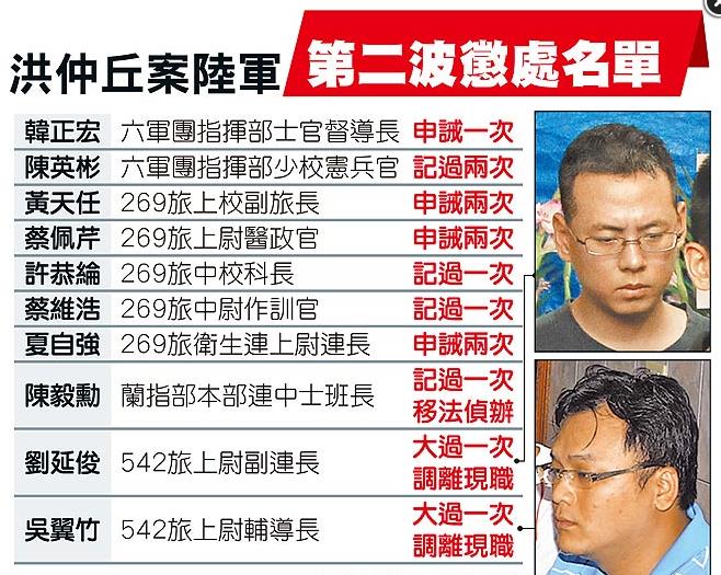 其中包括家屬先前質疑未列入第一波懲處名單的269旅副旅長黃天任上校、542旅部連副連長劉延俊中尉,及在洪仲丘悔過期間實施體能訓練的蘭指部班長陳毅勛中士。