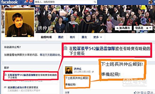 洪仲丘在臉書自陳“在路軍裝甲542旅擔(dān)任有時(shí)爽有時(shí)飛的下士班長(zhǎng)”,還留言“下士班長(zhǎng)洪仲丘報(bào)到!準(zhǔn)備起飛”,不料卻在退伍前夕被關(guān)禁閉致死。圖片來源:臺(tái)灣《中國(guó)時(shí)報(bào)》