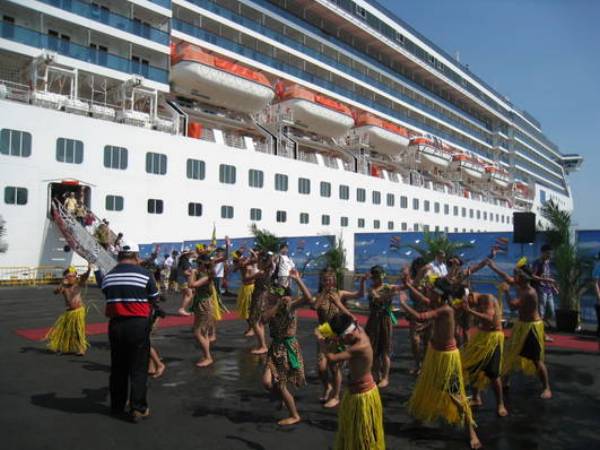 豪華國際郵輪“大西洋號”,今天帶來2600名游客抵達臺中港,臺中市政府觀光旅游局安排原住民歌舞迎賓。(圖片來自臺灣“中廣新聞網”)