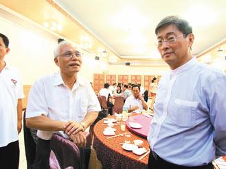 臺灣中華統(tǒng)一促進(jìn)黨總裁張安樂(右)昨天到左營會面當(dāng)?shù)乩镩L。(圖/臺灣《聯(lián)合報》)