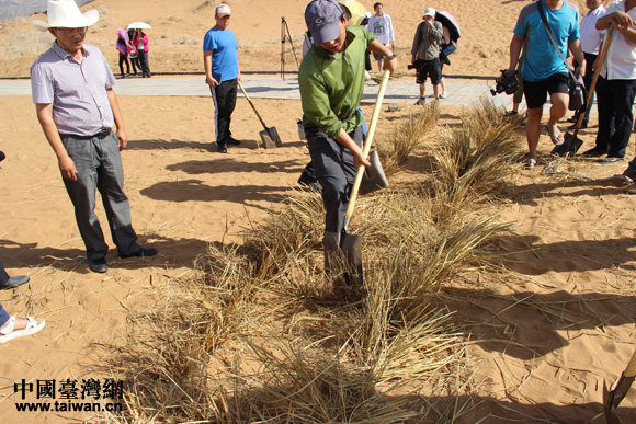 沙坡頭技術人員向兩岸記者實際演示麥草方格技術(中國臺灣網 王文英 攝)