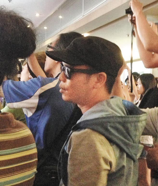 圖中帶墨鏡粉絲昨日想盡方法接近徐若瑄,被工作人員嚴加看管。(圖片來自臺灣《中國時報》)