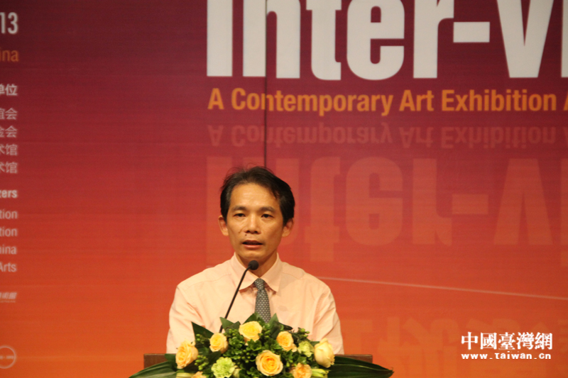由中華文化聯誼會、臺灣美術基金會、中國美術館、臺灣美術館聯合主辦的“2013海峽兩岸當代藝術展”,8月26日在中國美術館開幕,臺灣美術館副館長張仁吉在開幕式上致辭。(中國臺灣網 蕪同 攝)