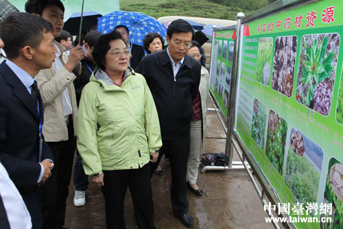 林文漪冒雨考察赫章平山鄉(xiāng)農(nóng)場壩GAP中藥材示范基地。右一為畢節(jié)市委書記張吉勇。(中國臺灣網(wǎng)發(fā) 畢磊 攝)