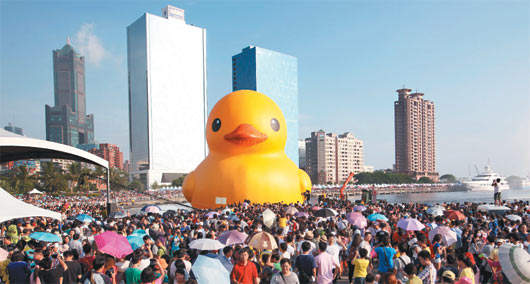 由荷蘭藝術(shù)家霍夫曼設(shè)計(jì)并授權(quán)高雄市展出的黃色小鴨(Rubber Duck),昨天下午4點(diǎn),在3艘大型拖船鳴笛、噴水柱的“貴賓級(jí)”迎賓儀式中,緩緩“游”進(jìn)高雄光榮碼頭,第1天共有20萬人爭睹這只高18米高的超萌小鴨。(來源:臺(tái)灣《聯(lián)合報(bào)》)