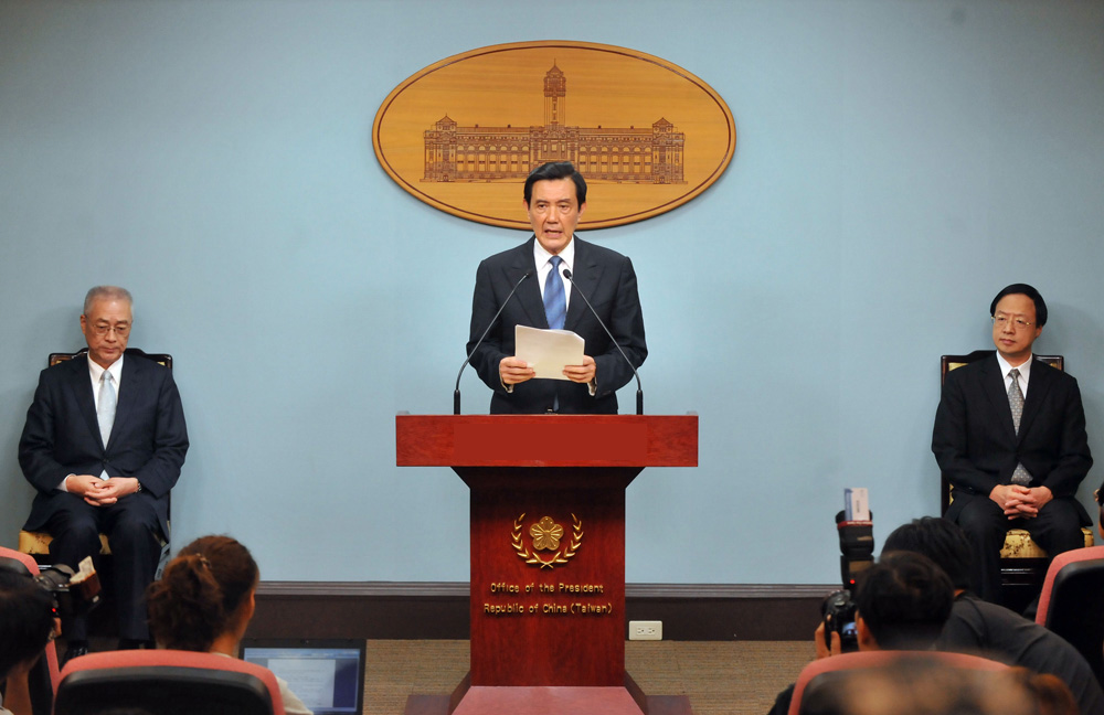馬英九9月8日在其官邸召開記者會,稱王金平涉入司法關說案是臺灣民主法治發展上“恥辱的一天”,作為臺灣地區領導人,他無從回避,必須挺身而出,捍衛臺灣民主法治。左為臺灣地區副領導人吳敦義、右為臺“行政院長”江宜樺。(圖片取自網絡)