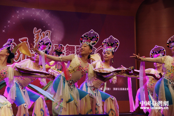 第六屆中華文化快車——北京心靈呼喚藝術團7日晚間在臺灣中國文化大學舉辦歌舞晚會,圖為演員們表演敦煌舞蹈《千手觀音》。(中國臺灣網 普燕 攝)