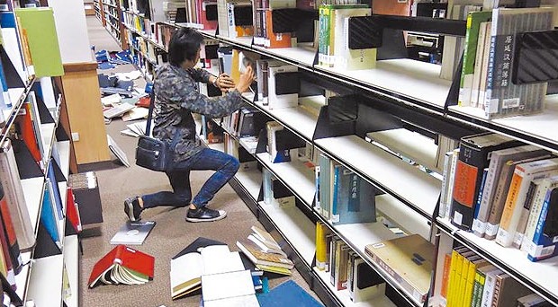 位于花蓮的東華大學圖書館藏書掉落滿地,校方漏夜整理。(臺媒圖)