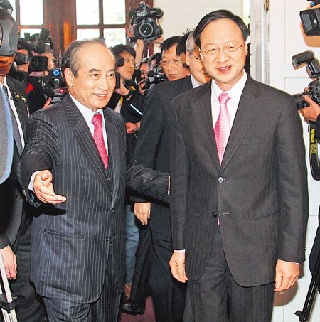 江宜樺(右)今年2月19日上任“行政院長”當天,即拜會“立法院長”王金平,表示未來許多重大法令通關都仰賴他的支持。但9月以來,由于王金平涉入司法關說個案,馬英九、江宜樺與王金平的關系一度陷入僵局。外界解讀認為,馬、江發動“政爭”的原因之一是,王在相關法令通關上未予執政黨全力支持。(來源:臺灣《中國時報》)