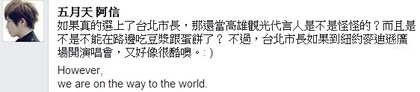 阿信在臉書回應參選臺北市長一事。(圖片取自臺媒)